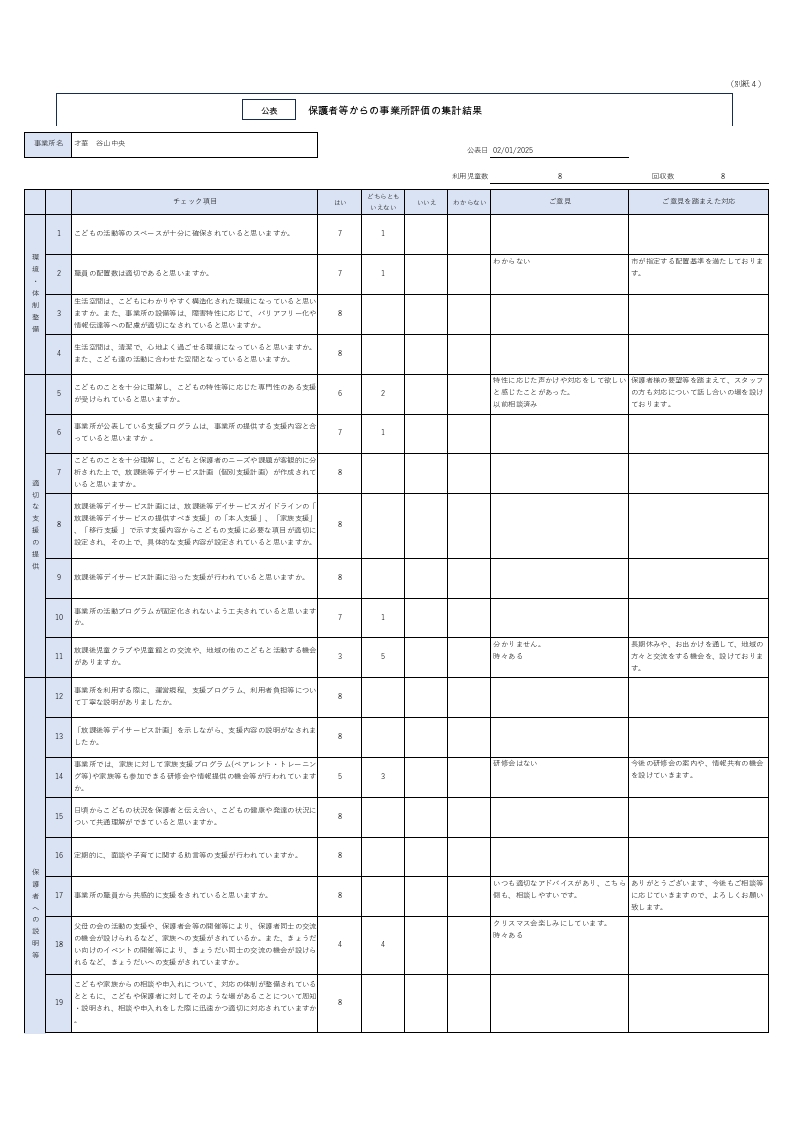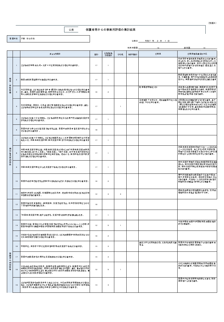 この結果をもとに、改善できるところは速やかに実施いたし、利用者の満足度をさらに高めていきたいと思います。